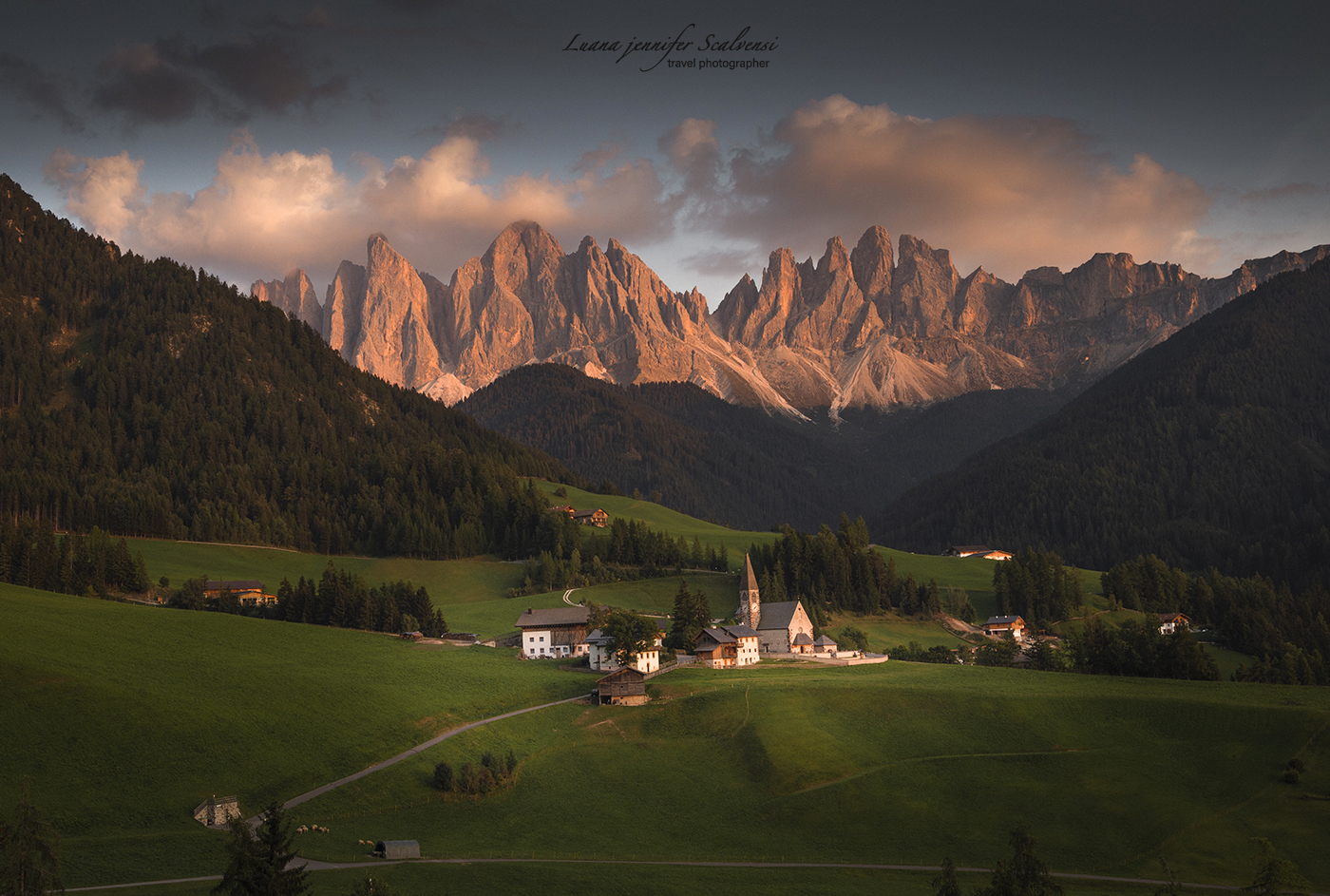 Poco lontano dalla chiesa di Ranui vi attende un altro luogo da cartolina: il piccolo paesino di Santa Maddalena e la sua omonima chiesetta, uno dei simboli della valle. Per poter ammirare il paese e la valle circostante raggiungete il punto panoramico a piedi dal paese, tramite un sentiero di 2 chilometri tra i campi in salita: una lunga passeggiata che certamente vi ripagherà della piccola fatica quando arriverete in cima. Inoltre se avete la fortuna di visitarla in una bella giornata di sole, potrete assistere ad uno dei tramonti più belli della vostra vita grazie al fenomeno dell'enrosadira. Sarà davvero emozionante, vi assicuro, contemplare nel silenzio il panorama mentre il gruppo dell'Odle si tinge di rosa.