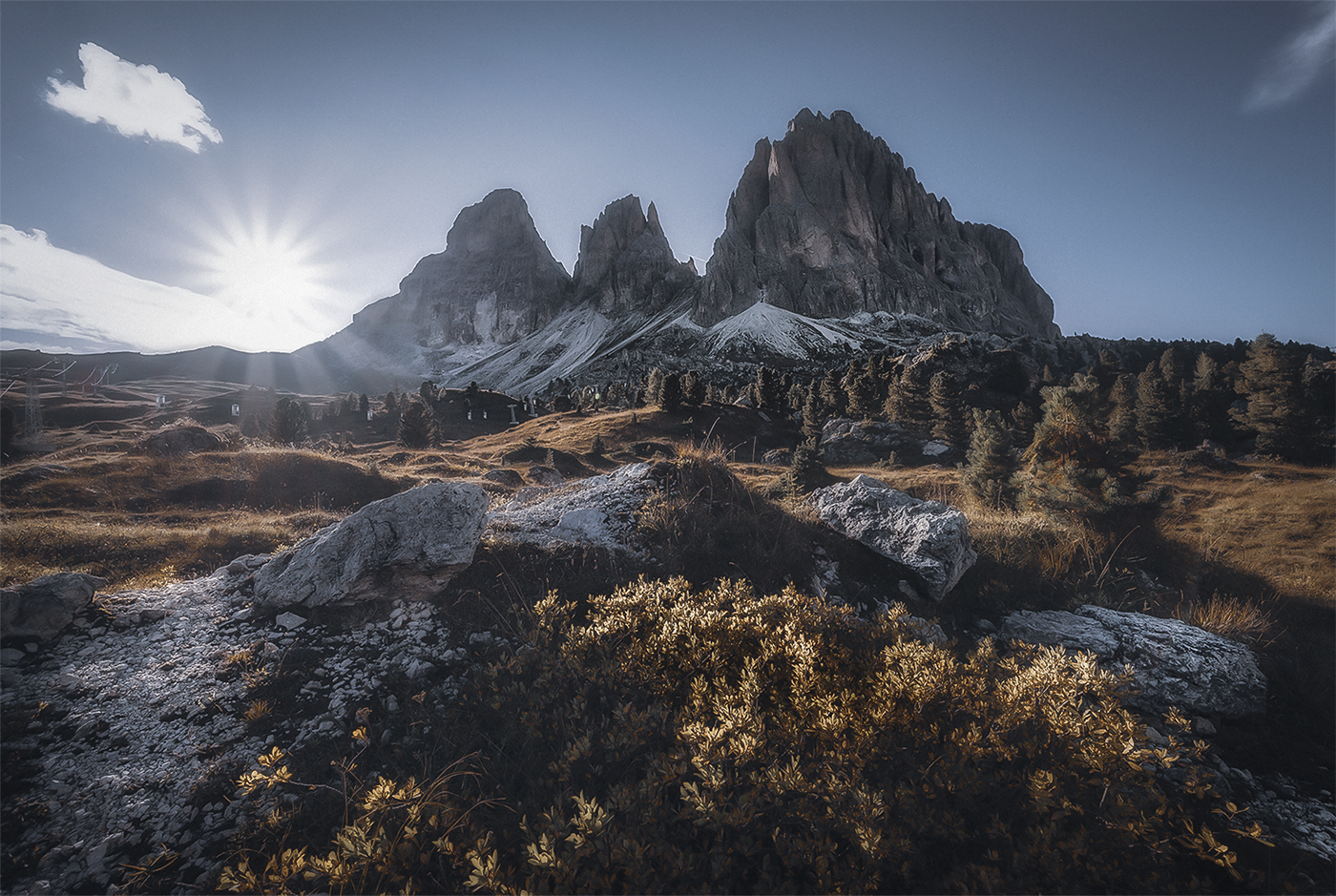 Uno degli spot fotografici più belli si ha dalla cima della collina verso la caratteristica Ra Gusela, iconica cima del gruppo del Nuvolau, simbolo del Passo Giau. Durante la mia visita il tempo è stato davvero ballerino tra pioggia, sole e nuvole che si divertivano ad oscurare i fianchi delle montagne rendendo il panorama circostante molto suggestivo.