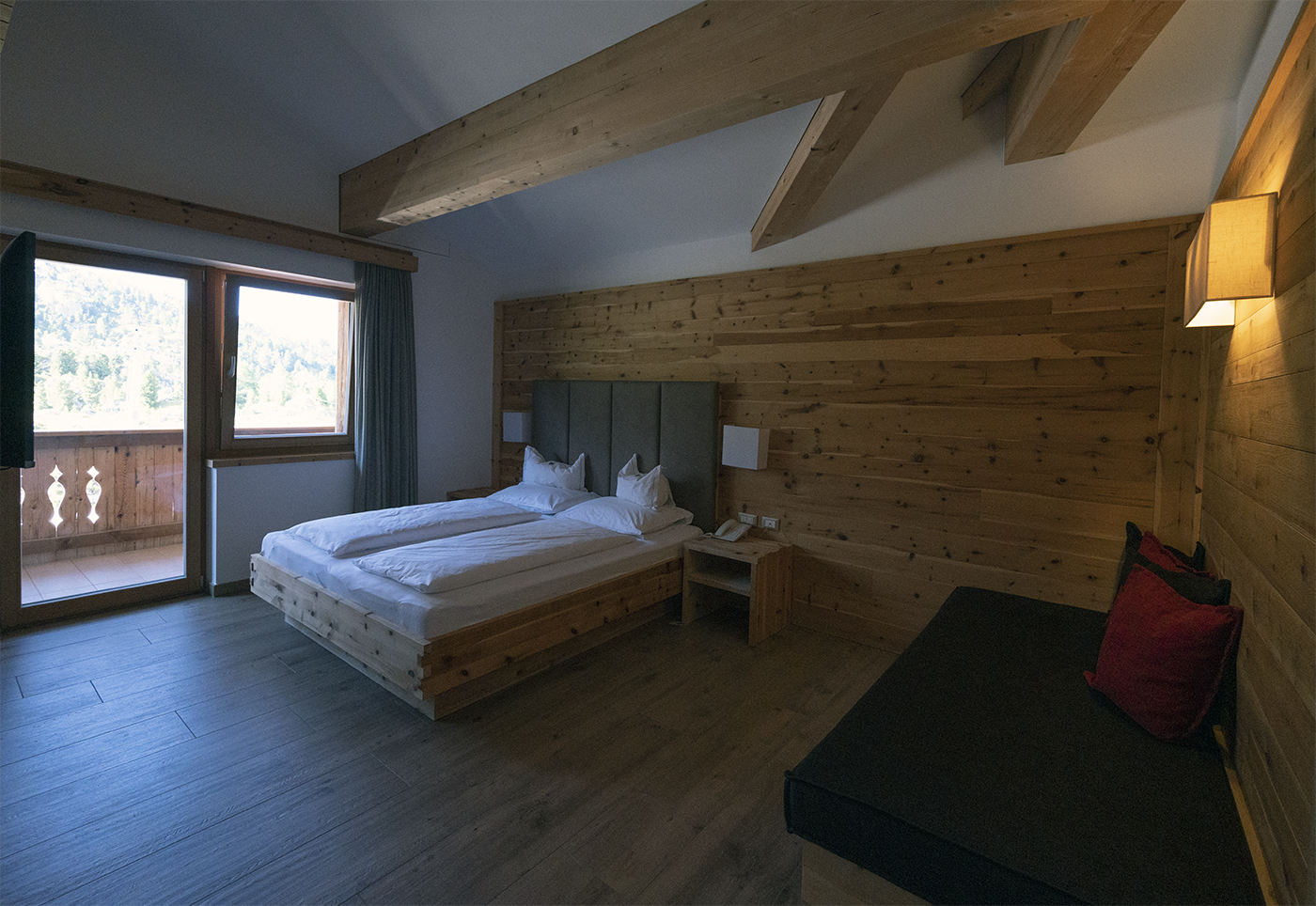 Le camere, in legno di cirmolo sono moderne pur mantenendo lo stile montano. Noi abbiamo soggiornato in una camera deluxe, grande su due piani dotata di terrazzina con vista sul gruppo del Sella. Vista spettacolare sulle montagne e sulla valle circostante.